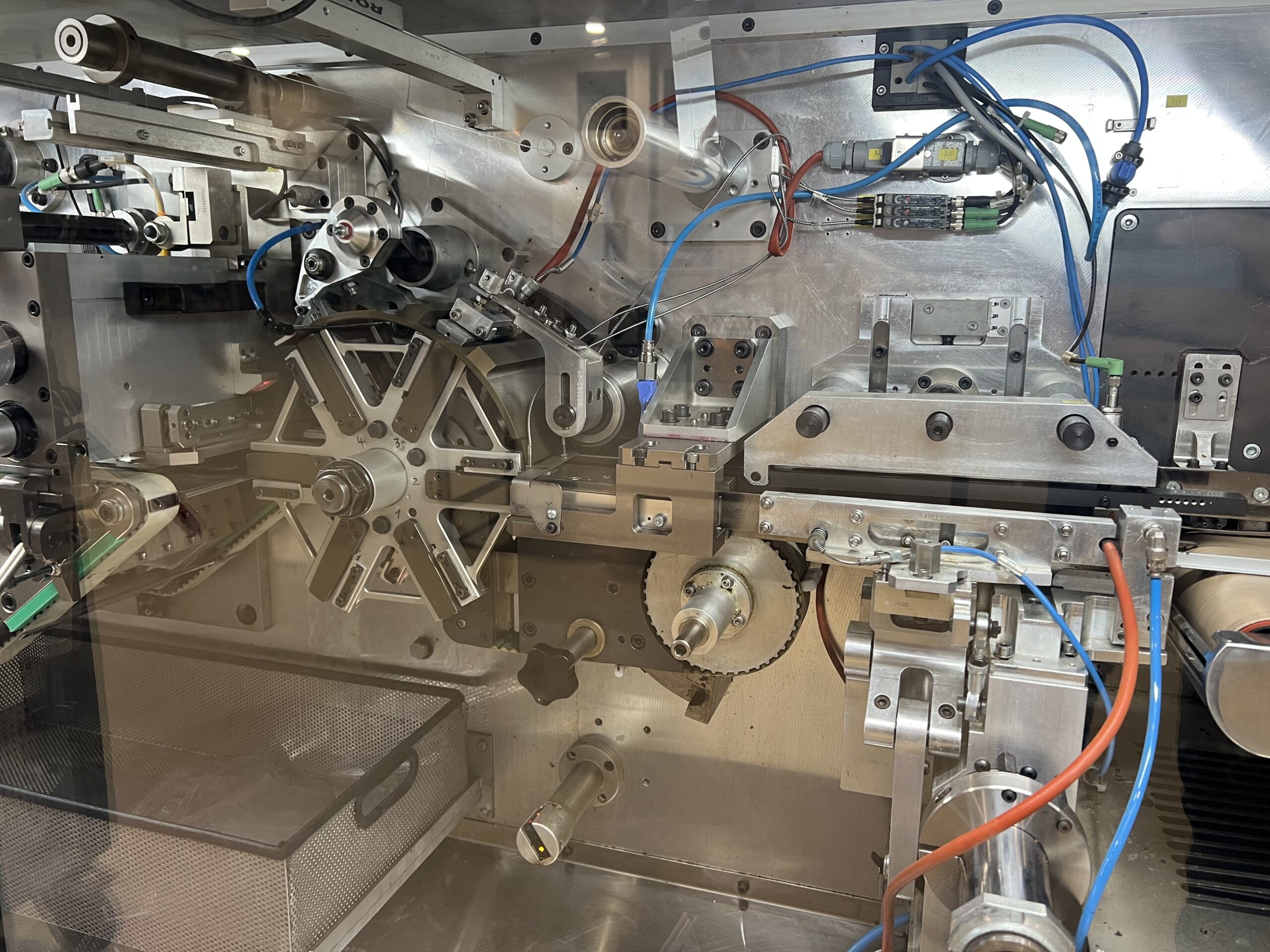 - Eye-mark detection: A photocell ensures that products are correctly positioned on the wrapping material to prevent jams in the transverse sealing jaws. Misplaced products are automatically allowed to exit, avoiding production stoppages for cleaning.